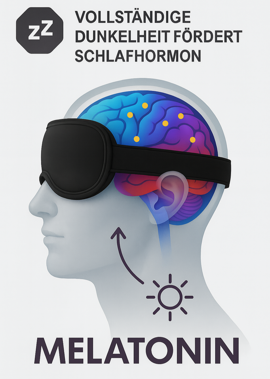 Melatonin ist das natürliche Schlafhormon des Körpers, das bei Dunkelheit ausgeschüttet wird. Die vollständige Abdunkelung durch unsere Maske signalisiert dem Gehirn: Es ist Zeit zu schlafen – ganz ohne künstliche Hilfsmittel.